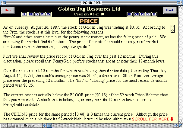 Clicking on any topic label (like "PRICE" or "VOLUME) will display a full report about that subject. For example, if you click on "PRICE" (in the PennyGold book, not on this Web page), you will get a full analysis about all price-related information (screenshot below).